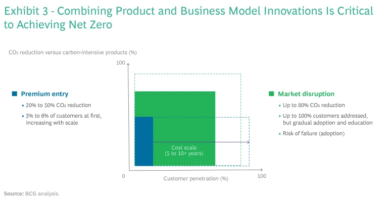 These business models are not only more sustainable, they also tend to be cost efficient. As a result, they can cancel out the green premium incurred by new technologies, opening paths for broader and faster adoption. We estimate that the combination of technology and business model innovation has the potential to reduce emissions by up to 80%. While not all products or services are candidates for radical business model innovation, combining premium-entry and market disruption strategies will in many sectors be essential to achieving substantial progress toward net zero. (See Exhibit 3 and the sidebar, "Combining Deep Tech and Business Model Innovations in the Auto Industry.")
