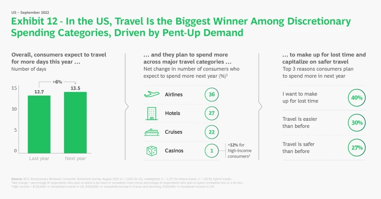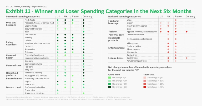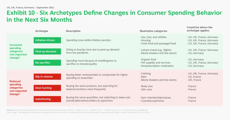 We have identified six archetypes of consumer spending behavior that define where consumers plan to increase net spending versus where they plan to decrease it during the next six months as they face inflation and a softer economy. (See Exhibits 10 and 11.) Consumers across countries say that they expect to increase their spending in inflation-driven essentials categories such as gas, utilities, food, and housing. Consumers continue to anticipate spending more in categories restricted by COVID-19, such as travel, a sign of pent-up demand. (See Exhibit 12.) Categories in which consumers typically do not reduce consumption during recessions—such as organic food, pet supplies and nonprescription medication—are also likely to see a lift in revenues, given consistent purchasing despite inflated prices.