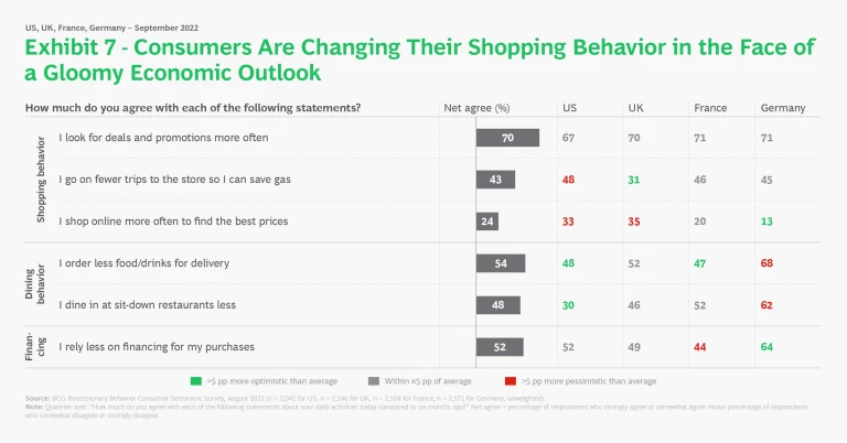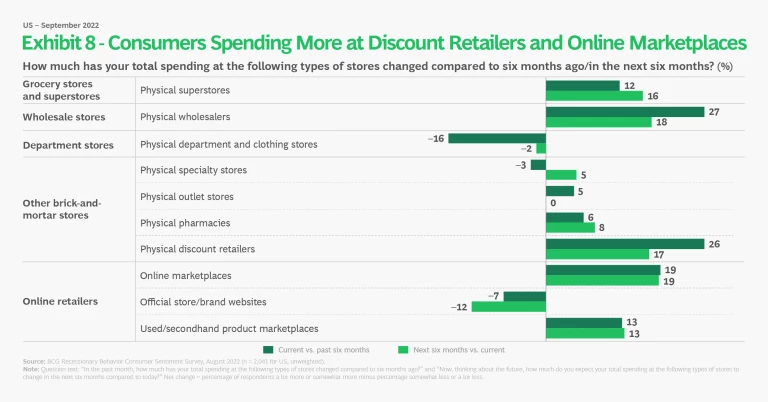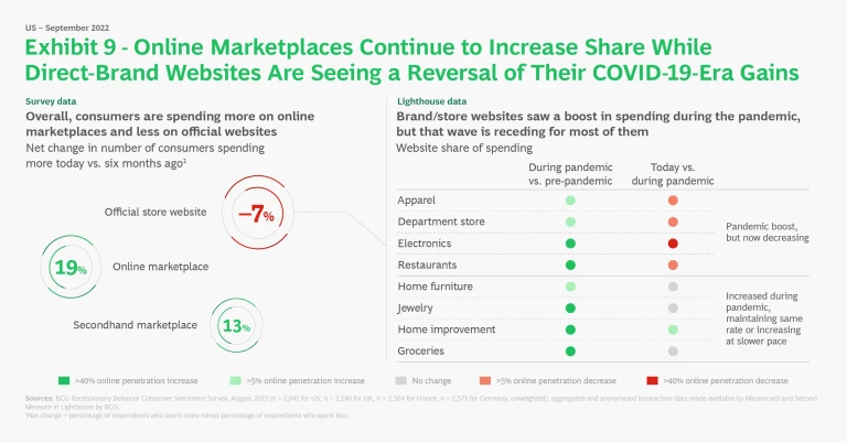 Shopping behavior is shifting as consumers not only look for deals and promotions, but also make fewer trips to the store or shop online more often, likely to avoid expensive gas usage. Increasingly, consumers are trying to save by cooking at home rather than ordering takeout or going to restaurants. (See Exhibit 7.) Relatedly, discount retailers and online marketplaces have seen a surge in spending at the expense of official store websites. (See Exhibits 8 and 9.)