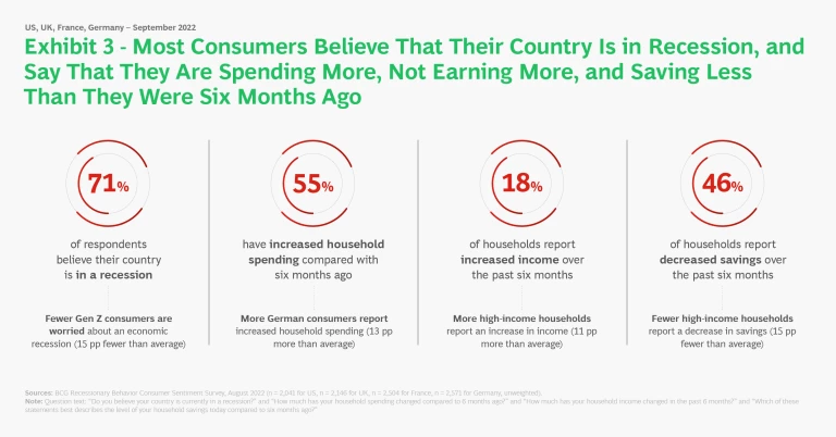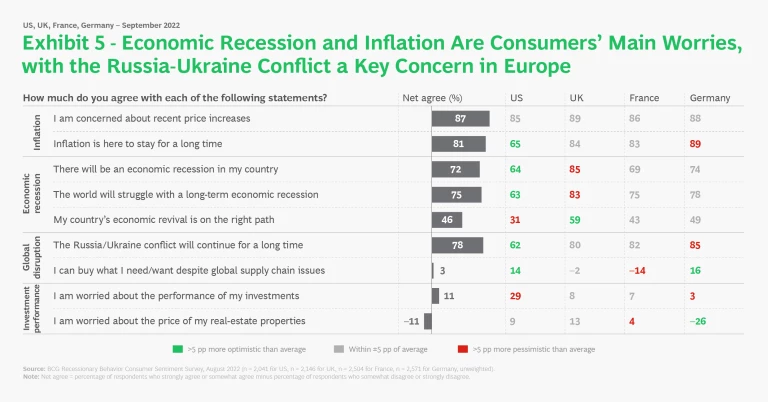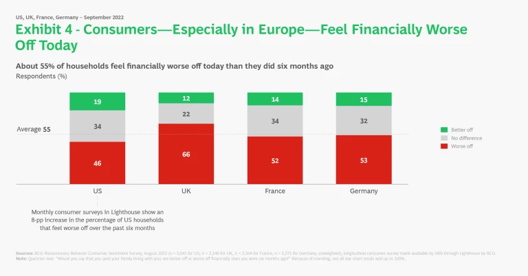 That said, most consumers across the four countries we researched believe that we are in a recession—and say that they are spending more and saving less. (See Exhibit 3.) Only 18% have seen their income increase in the past six months, and over half believe that they are financially worse off today than they were six months ago. (See Exhibit 4.) The recession and inflation are primary concerns across countries, in 87% and 81% of net households, respectively. Fear of a prolonged Russia-Ukraine war is also raising concern, but that concern is significantly higher in Europe, at 80% or more, than in the US, at 62% of net households. (See Exhibit 5.) And although fewer consumers say that they feel financially worse off in the US than do in other countries, as of early September, only 31% of net households in the US households agree that their country is on the right economic path, compared with 59% in the UK, 49% in Germany, and 43% in France.