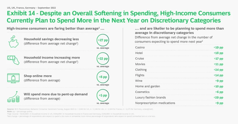 Predictably, consumers expect to decrease net spending on nonessentials such as clothing, increase deal hunting, and substitute lower-cost brands and alternatives. The category that consumers across multiple countries most consistently point to as an area where they are likely to reduce their spending is clothing. (See Exhibit 13.) But while average consumers plan to rein in their spending on nonessentials, many high-income consumers still express an intention to spend more in discretionary categories, suggesting that the recession has yet to impact this group. (See Exhibit 14.)