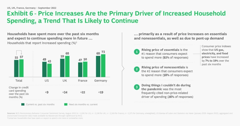 Not only are consumers spending more today than they were six months ago, but they are also saying that they believe that increased spending will continue in the future. (See Exhibit 6.) Although rising prices of essentials are the primary driver of increased spending—a reflection of inflation—we also see some nonessential purchases and pent-up demand in categories restricted during COVID-19 contributing to higher spending.