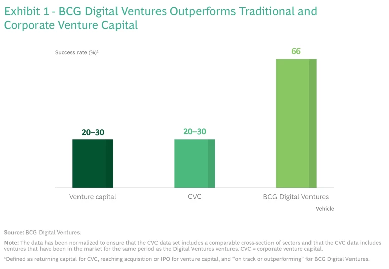 The venturing model pioneered by Digital Ventures and its corporate partners has proven to be two to three times more likely to produce a success than the models used by traditional venture capital or corporate venture capital. (See Exhibit 1.)
