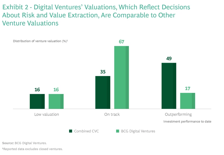 Moreover, the distribution of valuations for our corporate ventures yields a profile similar to that of other ventures when normalized for time in market. (See Exhibit 2.) Digital Ventures’ portfolio skews toward more “on-track” versus “outperform” investments, which likely reflects deliberate choices to have value accrue to the corporation—in the form of improvements in customer retention or operational productivity, for example—rather than to the new entity, as well as the effects of corporate backers’ more risk-averse governance and decision making.