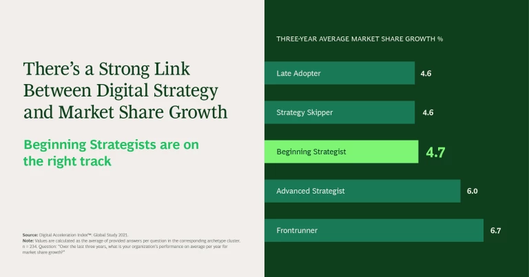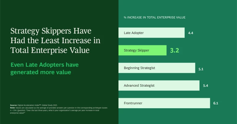 What’s especially striking from our findings is that even though Strategy Skippers are committed to moving fast and investing in digital technology and employee capabilities, they consistently place fourth or fifth across a range of important performance metrics (see slideshow). For example, over the past three years, Strategy Skippers grew their market share by an average of 4.6% per year, while Advanced Strategists and Frontrunners grew their market share by 6.0% and 6.7%, respectively. Similarly, over the same period, Strategy Skippers grew total enterprise value by an average of 3.2% per year, while Advanced Strategists and Frontrunners grew total enterprise value by 5.4% and 6.1%, respectively.