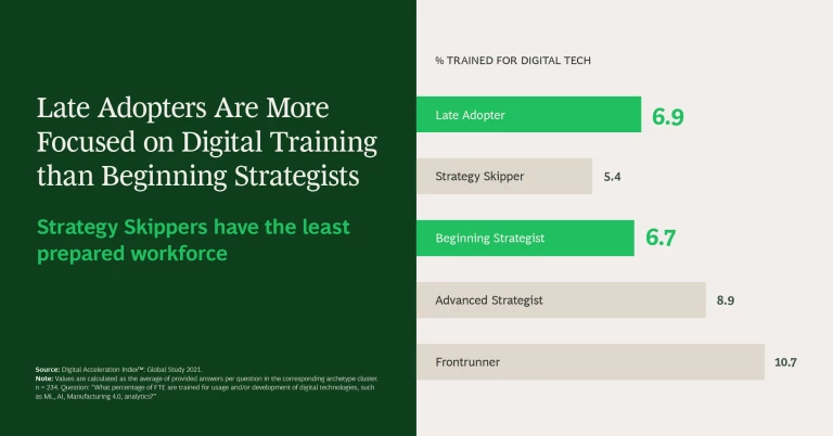 Strategy Skippers. This group (16% of the surveyed group) has largely bypassed defining a digital strategy and instead immediately began investing in digital technologies and employee capabilities. They implement digital use cases opportunistically, often without a clear business rationale. Lacking a target picture to guide them, Strategy Skippers can’t effectively scale their efforts.