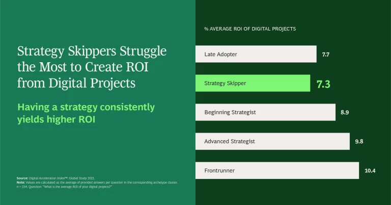 This insight has significant implications for Late Adopters that need to get their digitization underway, and for Strategy Skippers that desperately need to course correct given that their current approach to digitization is yielding such poor results.