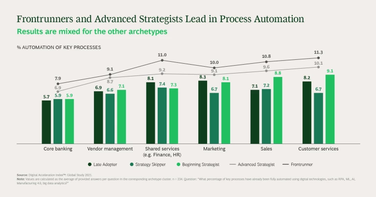 Compared to other archetypes, Frontrunners (which accounted for 23% of the surveyed institutions) perform exceptionally well across multiple performance metrics, including market value and growth performance, impact of digital initiatives, and levels of process automation. The bottom line is that being a Frontrunner pays off handsomely. Geographically, Frontrunners are more common in Asia and less common in Europe and North America. For example, 31% of FIs in Asia are Frontrunners, yet just 18% of European FIs have reached this level of digital maturity. This is most likely due to Asia having a generally younger, more digitally oriented customer base and an ecosystem of disruptive platform players (e.g., Tencent, Alibaba, and JD.com) creating growth opportunities.