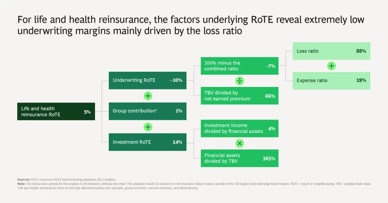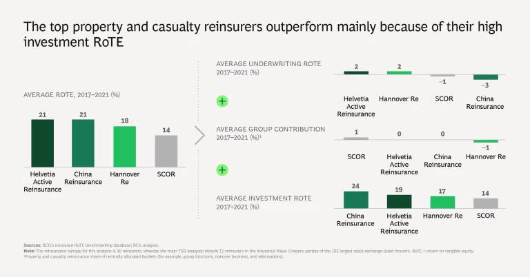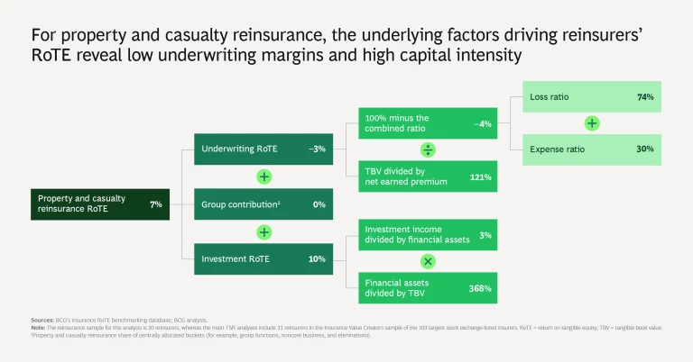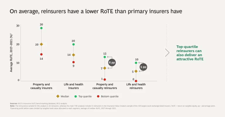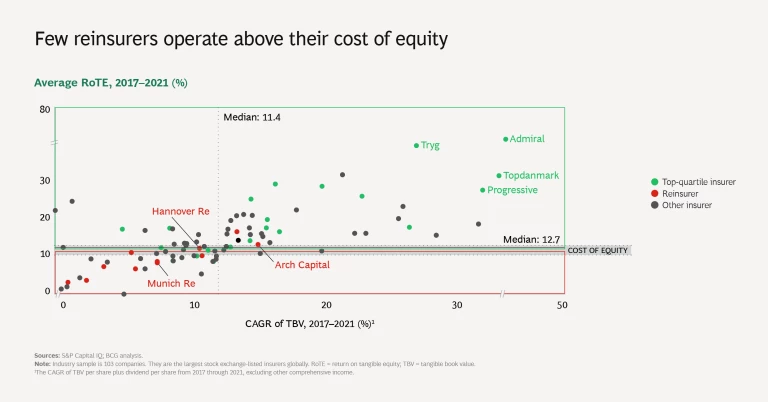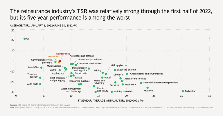 Other comparisons are less favorable. Only one reinsurance company is among the top quartile of insurance value creators by five-year TSR. And looking across industries, reinsurers’ five-year average annual TSR of approximately 8% was well below the average of 15% for the S&P 500 and placed reinsurance 27th among the 34 industries tracked by BCG.