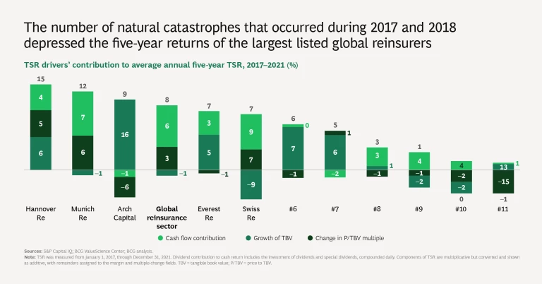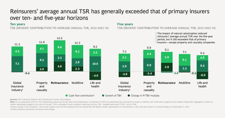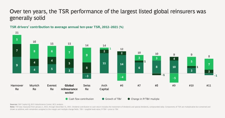 Over the ten years from 2012 through 2021, reinsurers’ average annual TSR of 14.5% eclipsed that of all sectors of primary insurance (property and casualty, multiline, and life and health). In recent years, the impact of natural catastrophes has put pressure on reinsurers’ TSR. Even so, their average annual TSR of 8.1% over the five years from 2017 through 2021 still surpassed that of all primary insurance sectors—except for property and casualty. However, comparing the top-quartile performers in reinsurance with those in the global insurance industry, we found that reinsurers’ outperformance was driven by cash flow contributions (dividends and share buybacks) and favorable multiples, not growth in tangible book value (TBV).