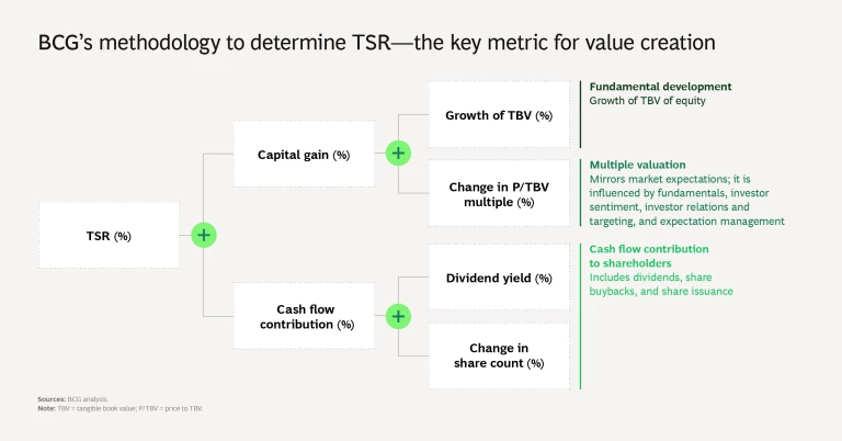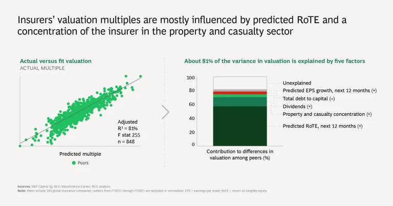The most important challenge for management is making the right tradeoffs among increasing TBV, deploying free cash flow, and expanding or protecting valuation multiples. BCG’s TSR methodology helps insurers explore these tradeoffs and make informed decisions about factors such as portfolio focus, capital allocation, and business units’ financial targets.