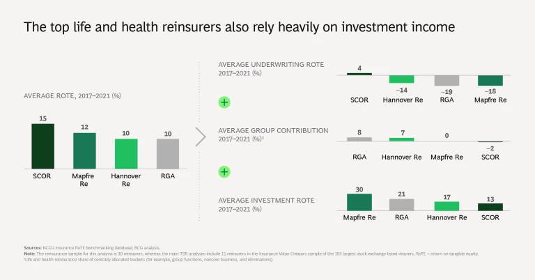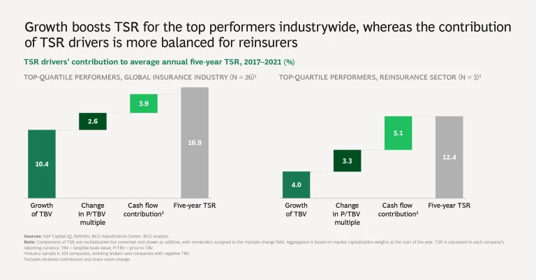 Each year, BCG looks at TSRs on a rolling five-year basis to illuminate long-term value creation. This year’s insurance company sample comprises the largest stock exchange-listed insurers worldwide: 103 players with a market capitalization of more than $4.5 billion at the end of 2021, including 11 reinsurers. These companies’ TSRs are straightforward to measure: we combine share price gains and the impact of dividends and share-count change. What’s more interesting is disaggregating the TSRs into their components.