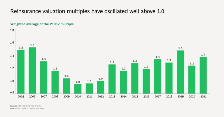 In reinsurance, as in primary insurance, TSR derives from three sources: growth in TBV, change in the price to TBV (P/TBV) multiple, and cash flow contribution (comprising dividend yield and change in share count). Over the long run, TBV growth and cash flow are the major contributors to TSR. Over the short to medium term, changes in the P/TBV multiple matter a lot more.