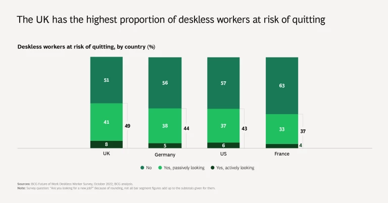 In Germany, 43% of deskless workers are looking for a different job, 38% of them passively and 5% actively. In the US, 6% are job-searching actively and 37% passively. The situation in France appears to be the least volatile, with 4% of deskless workers actively searching for new employment and 33% looking more casually.
