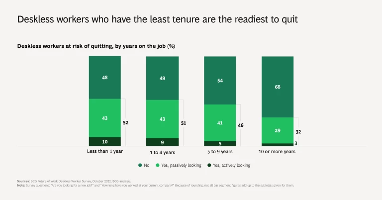 Invest in making work better. Just as companies commit to investing when they roll out new products or enter new markets, they must dedicate real effort to making work better for deskless workers. After an organization identifies potential changes to explore as possible ways to improve work, it must invest in the technology, upskilling, governance, and other enablers needed to support the new practices; then it must pilot and make necessary adjustments before rolling out and scaling the workplace changes. Investments don’t end there. If younger workers with less time on the job are the group most inclined to leave, employers need to invest in improving onboarding and career planning so that the people who represent the future of their workforce feel connected to and engaged with the organization, knowing that they have the attention and support of managers who can help them thrive even before they walk through the door.