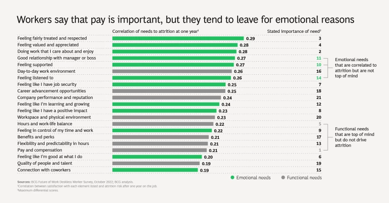 Conventional wisdom holds that deskless workers’ pay determines their sentiments about their jobs—and when asked, deskless workers themselves say that compensation is the aspect of their jobs that matters most to them. But our analysis of this group shows that when deskless workers consider leaving, the primary factors are emotional. In fact, eight of the top ten factors that motivate deskless workers to quit involve emotional rather than functional needs. At the top of that list: feeling fairly treated and respected, feeling valued and appreciated, doing work that’s meaningful and enjoyable, and having a good relationship with a manager or boss.