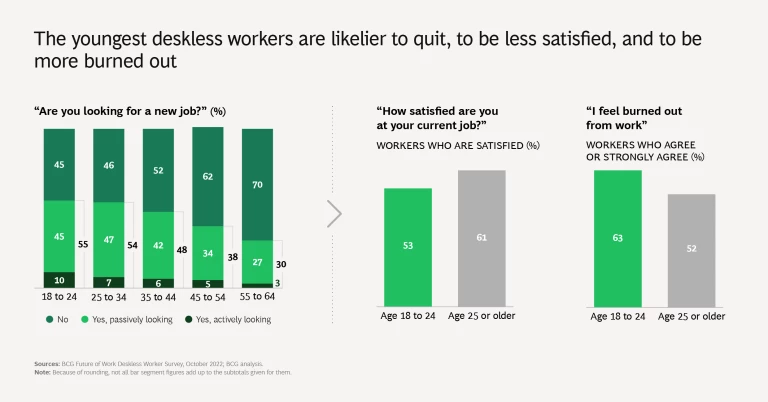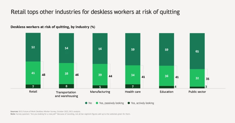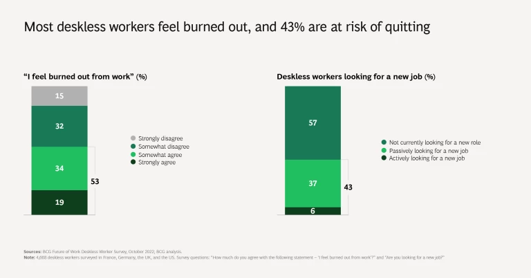Deskless workers in health care, retail, manufacturing, hospitality and logistics, and many similar industries represent 70% to 80% of the world’s labor force. While many people with office jobs switched to working remotely during the height of the COVID-19 pandemic, most deskless workers remained onsite. Now, more than half of them say that they are burned out, and 43% are either actively or passively looking for a new job, according to BCG’s latest survey of deskless workers.