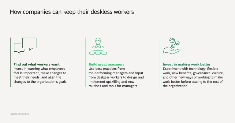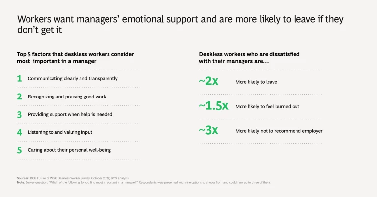 Build great managers. Managers are the glue that binds all workers to their jobs and to the organization. Our research shows that deskless workers who are dissatisfied with their managers are 50% more likely to feel burned out, three times more likely not to recommend their employer as a place to work, and twice as likely to leave. Organizations must ensure that their managers have the capabilities they need to deliver a great work experience. Companies that have successfully done so have identified top-performing managers, found out how they work, engaged those managers to teach their peers, and incorporated better ways of working into day-to-day routines. Great managers may not be able to stop active job seekers from looking, but they can keep passive job seekers in the organization.