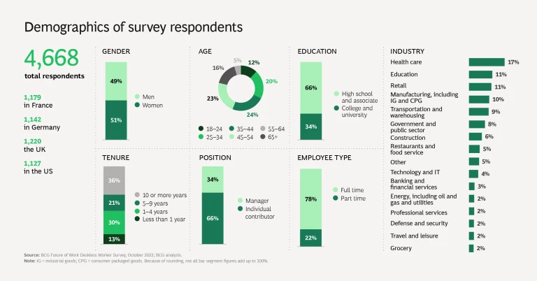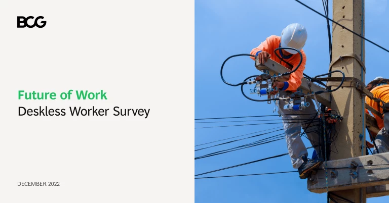 The findings are part of BCG’s research on the future of work, culled from a survey of more than 4,600 deskless workers in France, Germany, the UK, and the US. The respondents were almost evenly split between men and women, and they differed widely in age, level of seniority and job experience, and employment status.