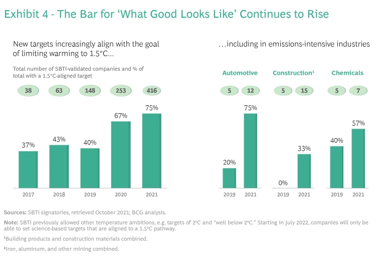 Climate Action as a Moving Target. As climate science has evolved and the understanding of the impact of rising temperatures becomes clear, the ambition for limiting temperature increases has shifted. (See Exhibit 4.) While limiting the temperature increase to 2℃ was seen as reasonable a few years ago, today the consensus view is that the increase must be limited to 1.5℃ to avoid potentially dire consequences—a view that is, for example, reflected in the updated SBTi guidance taking effect in July 2022. However, that is increasingly difficult as global emissions continue to rise, making more aggressive reductions necessary going forward. Both factors have driven a recalibration of what constitutes appropriate targets for companies.