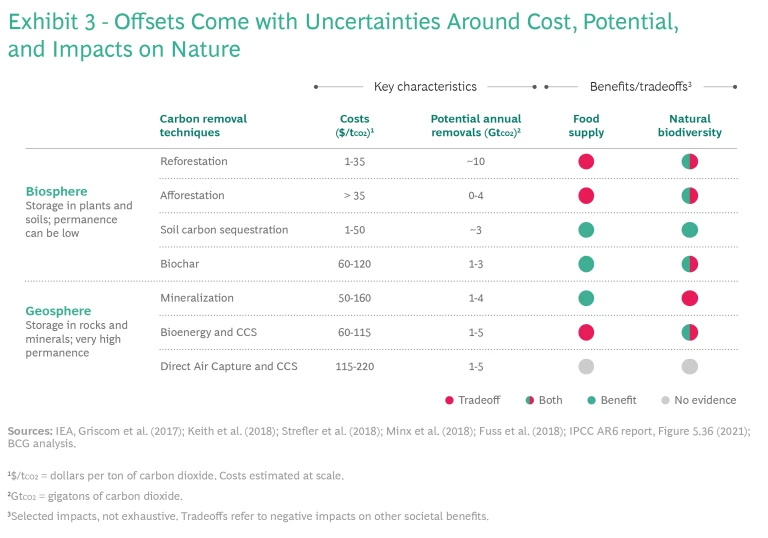 Use of Offsets as Part of the Mitigation Strategy. Interviewees identified the topic of offsets as another challenge. Offsets come in many forms, from afforestation to emerging technologies such as direct-air carbon capture and storage. But while there is nearly uniform consensus around the need to maximize emission reductions, there remains a lack of clarity around offsets. This includes uncertainty about future costs, the carbon-removal potential of each offset type, complexities related to possible tradeoffs for each offset type, and the overall role offsets should play in a company’s decarbonization journey. (See Exhibit 3.)