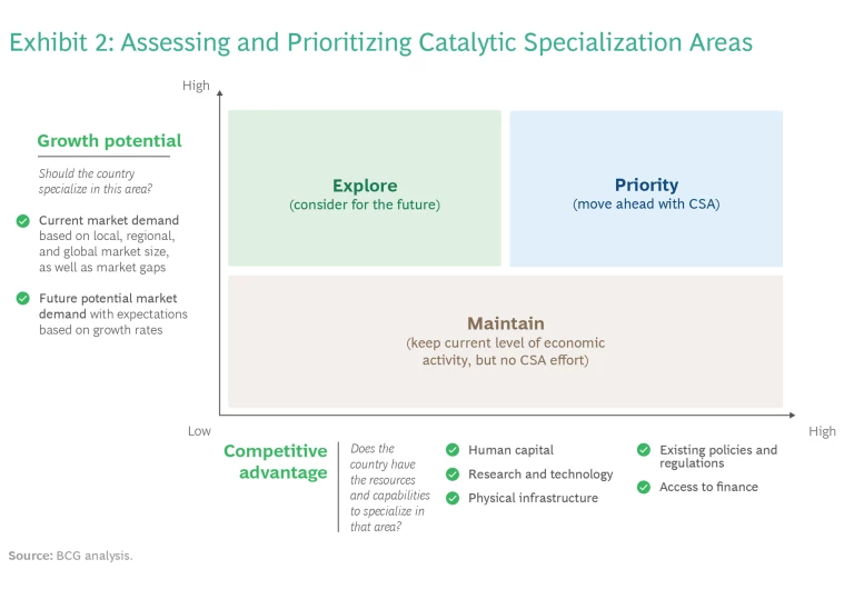 In this step, you assess the growth potential of CSAs identified in Step 1, and look at existing advantages in the broader economy. The goal is to generate a short list of catalytic specialization areas. As shown in Exhibit 2, there are two basic criteria: Growth potential of the CSA itself, and competitive advantage against other parts of the world. Based on the assessment, you either select each CSA as a priority now, explore its viability in the future, or maintain current activity in this sector, while holding back any CSA initiatives.
