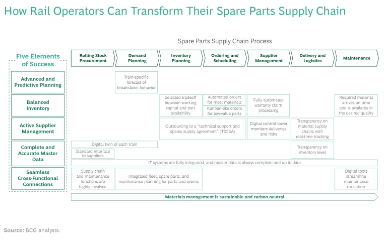 To achieve these goals, rail operators need to transform their spare-parts supply chain organization. By combining digital tools with functional excellence, operators can fully exploit capabilities that already exist in their organizations. A transformative approach involves reimagining every part of the supply chain, from rolling stock procurement and demand planning to parts delivery and maintenance. The challenges are significant, but the opportunities are immense.