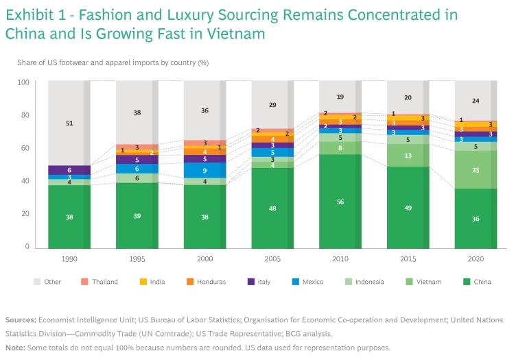 And the geographic concentration of suppliers has only exacerbated this challenge. Ten years ago, more than half of F&L sourcing took place in China owing to the low cost of manufacturing there. (See Exhibit 1, which uses US data for representation purposes.) As costs in China rose, many companies diversified their sourcing network, partnering with suppliers in Vietnam, Indonesia, Latin America, and Eastern Europe. Even so, over 50% of total volume today comes from just two countries: China and Vietnam.