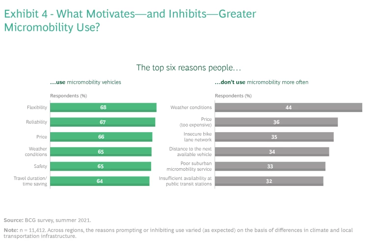 The Spurs. Beyond convenience and cost, users appreciate that, among other things, micromobility benefits the environment while also suiting their lifestyle. Indeed, the top six reasons people choose micromobility were of almost equal importance: flexibility, reliability, price, the weather (when it is pleasant), safety, and the opportunity to save time by reducing travel time. (See Exhibit 4.)