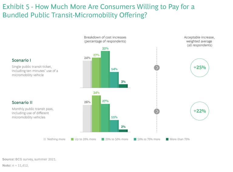 Scenario I features a single public transit ticket that also includes 10 minutes’ use of a micromobility vehicle. On average, respondents estimated that most users would be willing to pay 25% more than the current cost of a public transit ride. When translated into euros, this would mean that in Germany, for instance, where a ticket today on average costs €3, people would be willing to pay €3.75 for the bundle—a price below the current market price for most shared micromobility rides in Germany.