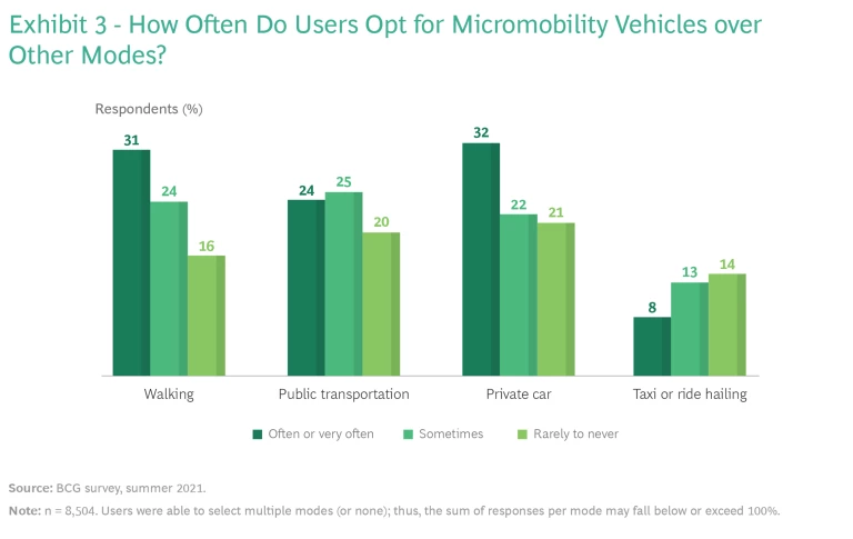 How often do people substitute micromobility vehicles for other transportation modes? The most frequent substitution occurs for private car use: 32% of users employ some form of micromobility “often or very often” instead of a private car. (See Exhibit 3.) When we look at the broader comparison, the picture looks somewhat discouraging. Consider that 55% substitute a micromobility vehicle for walking (31%) or public transportation (24%) often or very often, while 40% substitute a micromobility vehicle for a private car (32%) or taxi or ride hailing (8%) often or very often. Essentially, the impact of micromobility use today is at best neutral. There are not only insufficient replacements for private car use, but more of the substitution is taking place with the two greenest mobility modes, walking and public transit.