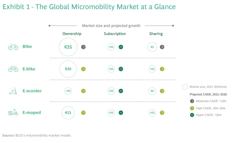 Exhibit 1 provides an overview of the 2021 global micromobility market, including growth rates, based on BCG’s micromobility market model. It shows market trends by vehicle and by usage model: whether ownership, subscription (in which the individual rents the vehicle for a specific period and is the sole user), or sharing (use of a provider’s vehicle for a single ride).