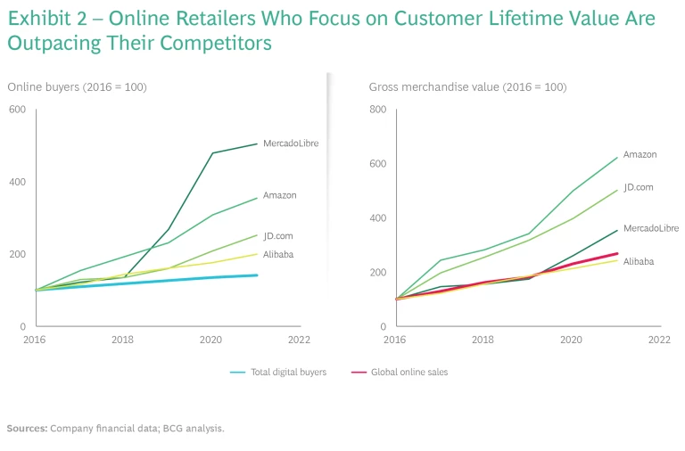Many of the world’s most successful digital-first retailers are known for their relentless focus on building customer lifetime value (CLV), rewarding loyalty with benefits and added service options such as fast shipping and media streaming—knowing that, in return, these customers will spend more over the duration of their membership. (See Exhibit 2.)