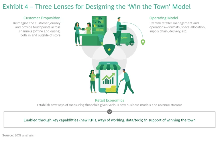 It’s possible for any retailer, regardless of size or product focus, to deploy a strategy of winning the town—building a winning position in each town it serves and driving increased consumer engagement, a larger share of sales, and lower operating costs. Applying this framework takes a willingness to rethink the customer relationship, the channels in which a company plays, and operational capabilities, as well as the overall business model and economics. (See Exhibit 4.)