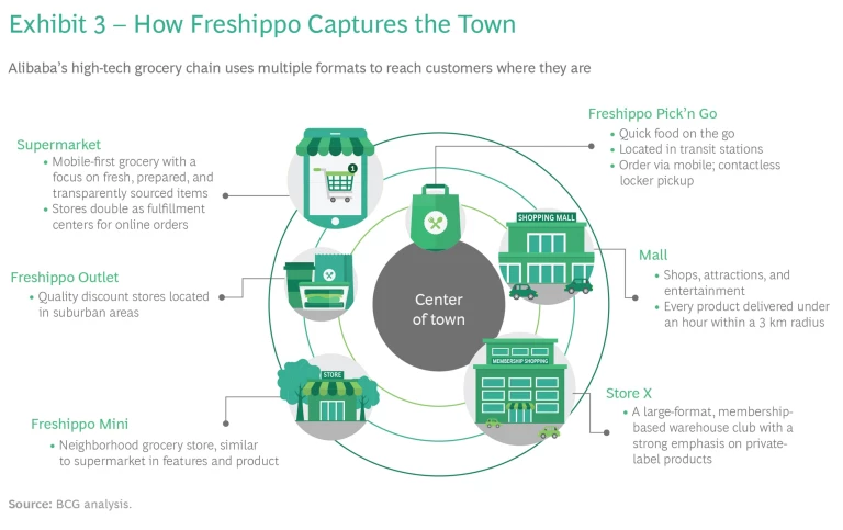 For its high-tech grocery chain, Freshippo, Alibaba has built a network spanning digital and physical touchpoints with their customers within major cities in China. They’ve built local scale through a brand of physical storefronts, delivering tailored offerings based on location: convenience shops near train stations, grab-and-go prepared-foods stops in business corridors, and neighborhood grocery stores in local communities. These formats are in addition to online shopping via Alibaba’s marketplace and fulfillment by stores that also can deliver directly to customers’ homes. Alibaba is expanding the number of customer touchpoints well beyond conventional in-person shopping, all while fulfilling multiple missions and becoming the go-to for all its customers’ food needs. (See Exhibit 3.)