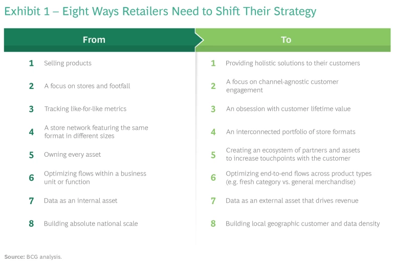 In the face of these market forces, retailers must completely rethink the customer proposition they offer and the operating and economic models they use. A one-size-fits-all value proposition is no longer a viable approach. Instead of trying to grow by implementing the same model everywhere, retailers must compete for customers at the local level with an approach that emphasizes customer density. This means creating a winning network, localizing through a deep understanding of the customer, and building a customer journey across multiple touchpoints. To do this, retailers must make several bold shifts in their strategy. (See Exhibit 1.)