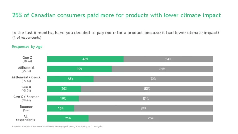 Conversations about climate and retailing in Canada quickly turn to the “say-do” gap, where consumers say they value the climate but do little to change their purchasing behaviour – especially during times of economic duress. However, fresh data from Boston Consulting Group’s annual Canadian Consumer Survey suggests that in spite of declining consumer confidence, a quarter of Canadians are still willing to purchase goods that align with their climate convictions in at least some product categories.