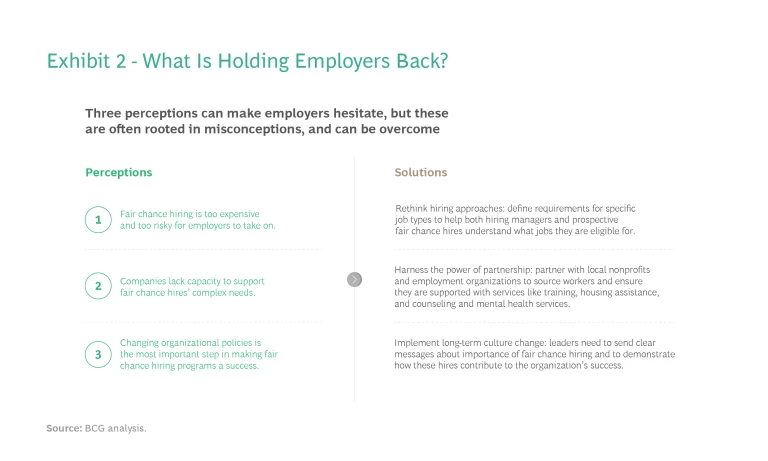 Qualified individuals with a criminal record face many obstacles in gaining employment, but among the hardest to surmount are worries about the risks they pose to employers and doubts about their potential as employees. We have identified three key perceptions—often rooted in misconceptions—that discourage employers from adopting fair chance hiring practices. We also provide solutions that can help employers overcome barriers and successfully implement fair chance hiring. (See Exhibit 2.)