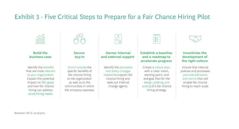 Step 1: Build the business case. Identify the benefits that are most relevant to your organization. Questions to ask include what economic benefits fair chance hiring will bring the company, what impact it could have on diversity, equity, and inclusion goals, and what acute talent needs it could address.