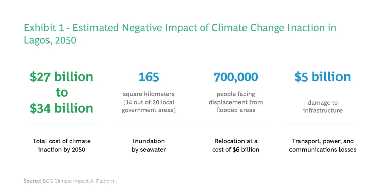 In the case of Lagos, a BCG team has been supporting the local government since 2021, using advanced data analytics to develop detailed, plausible local scenarios for climate change. The team has simulated and quantified many potential impacts, including damage to a variety of systems: Lagos’ critical infrastructure like power and transport; social systems like schools and hospitals; economic systems such as banks and commercial institutions; and natural systems such as wetlands and biodiversity.