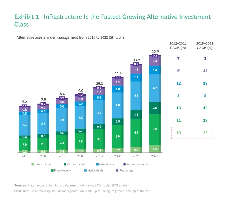 In anticipation of governments’ fiscal incentives, assets under management in the infrastructure industry rose from $0.9 trillion in 2021 to $1.1 trillion in 2022—a compound annual growth rate (CAGR) of 22.2%, only a little lower than the CAGR in assets of 23% from 2018 to 2022. (See Exhibit 1.) Last year, in terms of percentage growth, infrastructure funds attracted more money than all the other alternative investments did. Although real estate funds raised 25% more, private equity funds 21% more, and venture capital funds 9% more in 2022 than in 2021, infrastructure funds attracted an additional 50%, according to Preqin data.