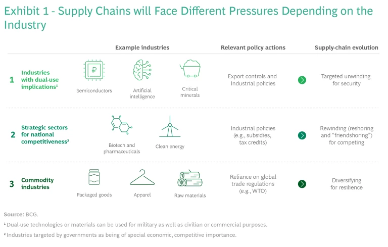 We believe players must prepare for a variety of risks that are likely to arise from government policies and customer behavior, depending on which of three segments the companies fall into. (See Exhibit 1.) To get ready for the new challenges, leaders should assess their companies’ supply chains using a few guiding principles.