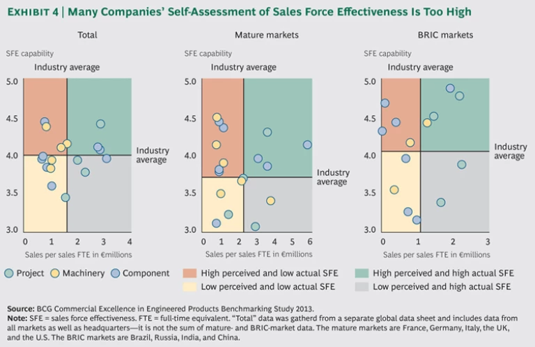 Notably, we also found that companies often overestimate their sales capabilities. Many companies consider their sales-force effectiveness capabilities to be high despite having low sales-force effectiveness as measured by sales revenues per sales FTE. This overestimation of capabilities is most evident in the machinery and component segments, where sales force effectiveness is often below the industry average even though capabilities are perceived to be above average. (See Exhibit 4.) This disparity holds true for both mature and BRIC markets.