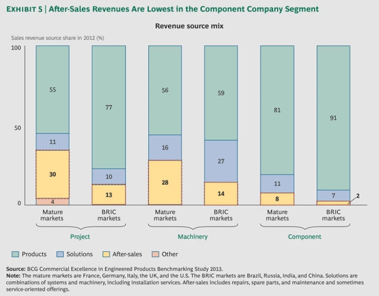 After-sales revenues as a percentage of sales are similar in the project and machinery segments—30 percent and 28 percent in the mature markets and 13 percent and 14 percent, respectively, in the BRIC markets. The component segment lags behind, with after-sales representing 8 percent of sales in mature markets and 2 percent in the BRIC markets. (See Exhibit 5.)