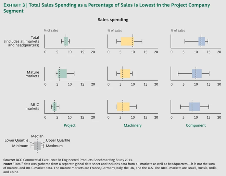 Global sales spending as a percentage of sales was lowest in the project company segment (indicating the highest level of sales force effectiveness) and highest in the component company segment. Sales spending as a percentage of sales is higher in mature markets than in the BRIC countries across all three company segments, although the difference is not significant. The higher spending in mature markets could indicate that many European companies still rely heavily on their headquarters for overseas sales and that sales structures are changing less quickly than customer demand. (See Exhibit 3.) The largest portion of sales spending is allocated to personnel costs. Trade fair participation, travel, and product samples are examples of other sales expenses.