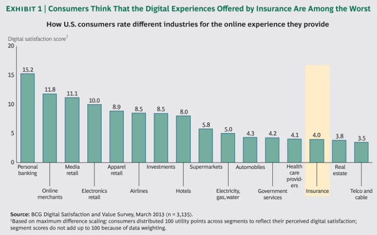 The trend of consumers handling more of their insurance needs on their own is already evident in the early stages of the insurance-buying process. The vast majority of consumers do the bulk of their initial research online, using tools such as search engines and comparison engines, over which insurers have little control. Most of these customers do still turn to agents to finalize their purchases, and that may lead some insurers to think that their traditional networks retain their old relevance. But in many cases, the only real utility provided by insurance agents lies in clarifying and confirming the many policy details that are confusing online. Indeed, in the eyes of consumers, insurers’ websites are among the worst of any major industry.  Recent research by BCG in the U.S. highlights the dissatisfaction that consumers feel when they interact digitally with their insurers. (See Exhibit 1.) But this dissatisfaction is not limited to the U.S.; consumers in most other parts of the world feel it, too. (See Evolution and Revolution: How Insurers Stay Relevant in a Digital Future, BCG report, September 2014).