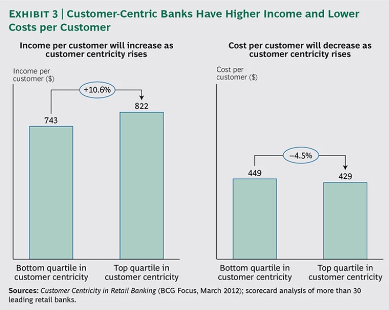 A bionic retail bank is customer centric. It uses knowledge of its customers to meet their needs and achieve sustainable, valuable, long-term relationships. It recognizes that there doesn’t have to be a trade-off between customer centricity and operational costs. In fact, BCG research indicates that customer-centric banks have both higher income and lower costs per customer than their non-customer-centric competitors. (See Exhibit 3.)