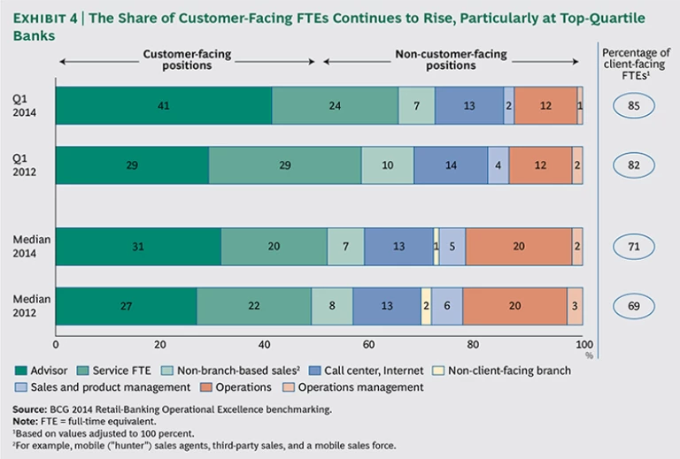 Technology and operations arguably constitute the domain that most differentiates bionic retail banks from more traditional institutions. More than 80 percent of staff in the world’s leading retail banks hold customer-facing positions, with less than 20 percent in back-office or head-office roles. Compared with an average ratio of 70:30 among other banks—and the frequent occurrence of 60:40 or even 50:50 ratios—the value at stake is substantial. Overall, the share of customer-facing full-time equivalents continues to rise, particularly at top-quartile banks. (See Exhibit 4.) What’s more, we find that the world’s most operationally advanced retail banks tend also to be the most customer centric.