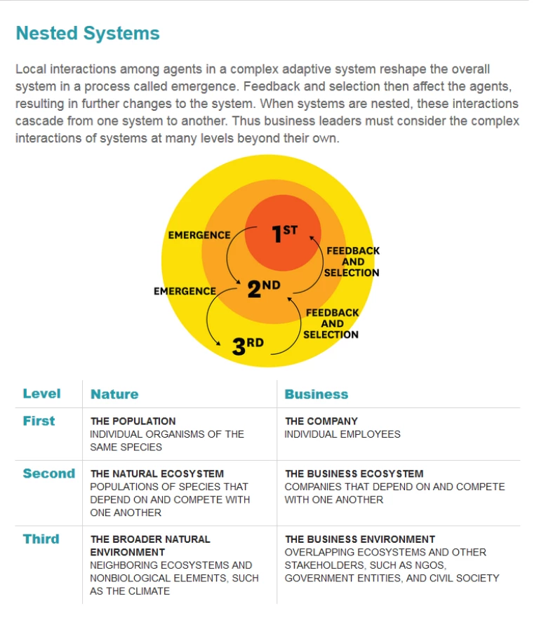 Complex adaptive systems are often nested in broader systems. A population is a CAS nested in a natural ecosystem, which itself is nested in the broader biological environment. A company is a CAS nested in a business ecosystem, which is nested in the broad societal environment. Complexity therefore exists at multiple levels, not just within organizational boundaries; and at each level there is tension between what is good for an individual agent and what is good for the larger system.