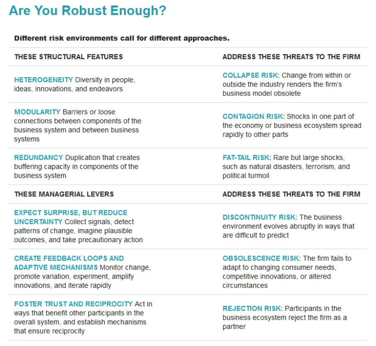 We have identified six principles that can help make complex adaptive systems in business robust. (For a related examination of complex adaptive systems in nature, see Fragile Dominion, by Simon Levin.) They derive from our study of features that distinguish dynamic systems that persist from those that collapse or decline. The first three principles are structural; they deal with the design of the system and are broadly seen in nature. The second three are primarily managerial; they deal with the application of the intelligence and intentionality provided by humans. Their key features have been observed in a wide variety of managed systems, from fisheries to global climate control agreements.